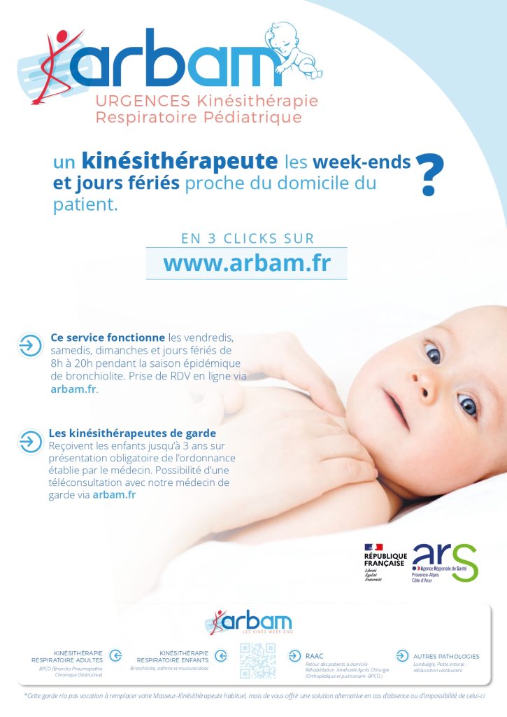 | Les kinésithérapeutes de garde reçoivent les enfants jusqu’à 3 ans sur présentation obligatoire de l’ordonnance du médecin. Par ailleurs, l’offre de l’ARBAM évolue progressivement, et vous pourrez trouver un.e kiné disponible pour les week-ends et/ou les jours fériés dans le cadre de différentes pathologies : entorse, lombalgie, kinésithérapie respiratoire adulte ou enfant, cas complexes, RAAC, BPCO. Contactez l’ARBAM au 09 75 18 15 15 ou en vous connectant sur le site arbam.fr. Les coordonnées du (ou de la) kiné de garde le plus proche du domicile vous seront ensuite transmises par SMS. Cette garde n’a pas vocation à remplacer l’offre habituelle de kinésithérapie, mais d’offrir une solution alternative en cas d’absence ou d’impossibilité les weekends et les jours fériés. |